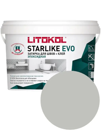 LITOKOL STARLIKE EVO - двухкомпонентный кислотостойкий и щелочестойкий эпоксидный состав для заполнения межплиточных швов шириной от 1 до 15 мм. Может использоваться в качестве клея для укладки стеклянной мозаики и плитки. При производстве эпоксидных составов STARLIKE EVO компанией LITOKOL используется запатентованная технология, при которой цвет состава задается окрашиванием частиц наполнителя. Отсутствие в фуге пигментов в свободном состоянии предотвращает окрашивание плитки в процессе заполнения швов. Благодаря своей пластичности состав легко наносится, полностью заполняя швы. После отверждения на поверхности LITOKOL STARLIKE EVO полностью отсутствуют трещины или раковины. Необычайная лёгкость очистки поверхности плитки после затирки швов, даже по сравнению с обычными цементными затирками.