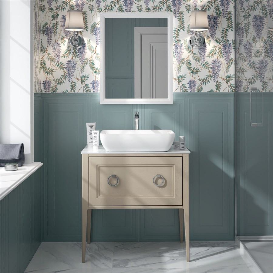 Фоновая плитка имеет нестандартный формат, за счет которого удается зрительно расширять пространство или делать его выше. Особенно выигрышно смотрится классическая комбинация «темный низ-светлый верх». Разграничивать плитку разных оттенков предлагается белыми бордюрами или декорами. В случае с последними производитель не ограничился одним вариантом. На выбор даются декоры с акварельным рисунком роз, глициний или старинных цветов, узор из которых может продолжаться до бесконечности. Собрать из них картину или панно, выделить зону душевой кабины или обрамить набор мебели для ванной комнаты – вариантов раскладки великое множество!